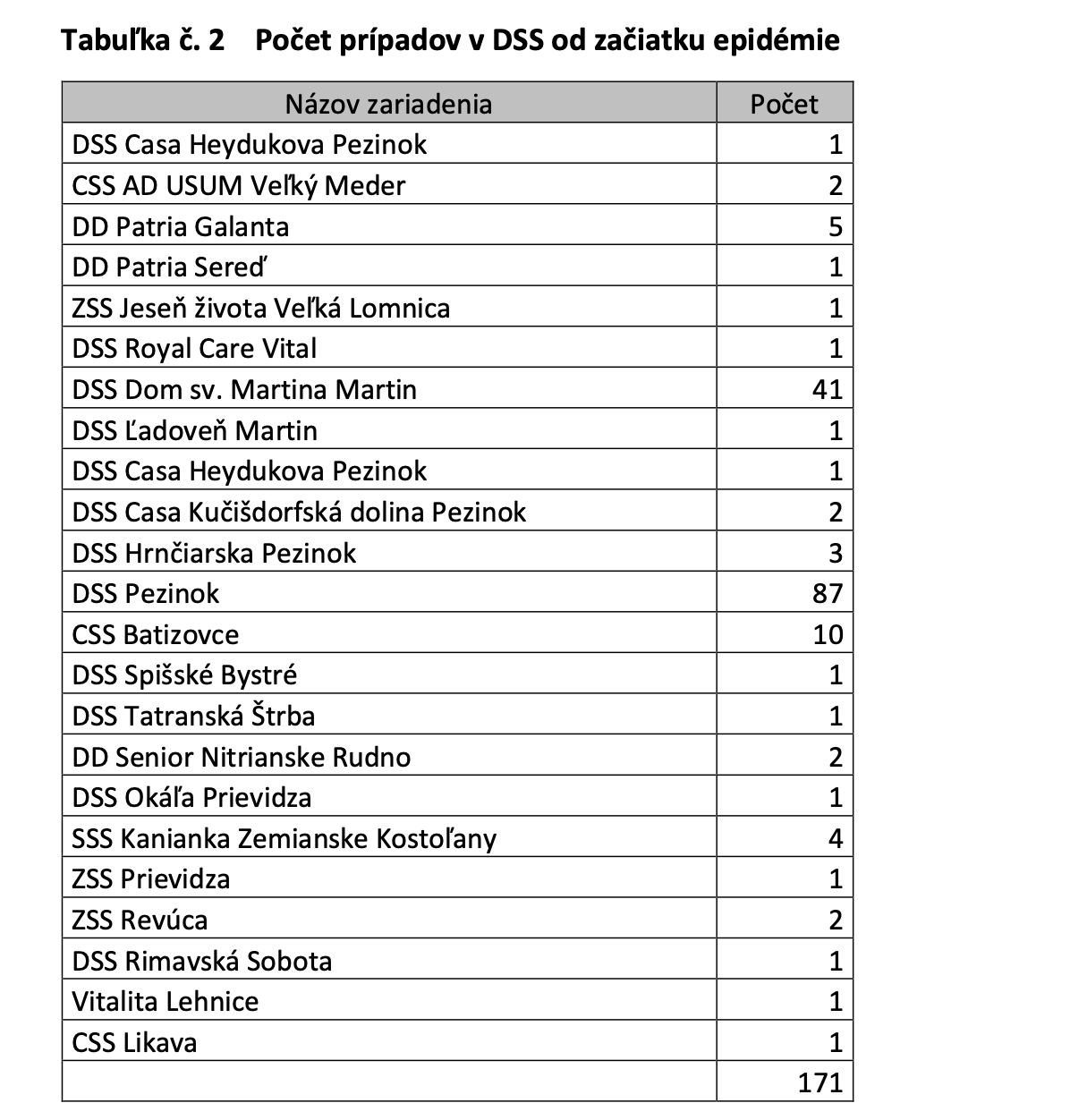 Celkovo 171 prípadov zaznamenali v 23 zariadeniach pre seniorov. Najviac nakazených sa vyskytlo v DSS Pezinok - 87, v Martine v dome sv. Martina - 41a v CSS Batizovce 10.