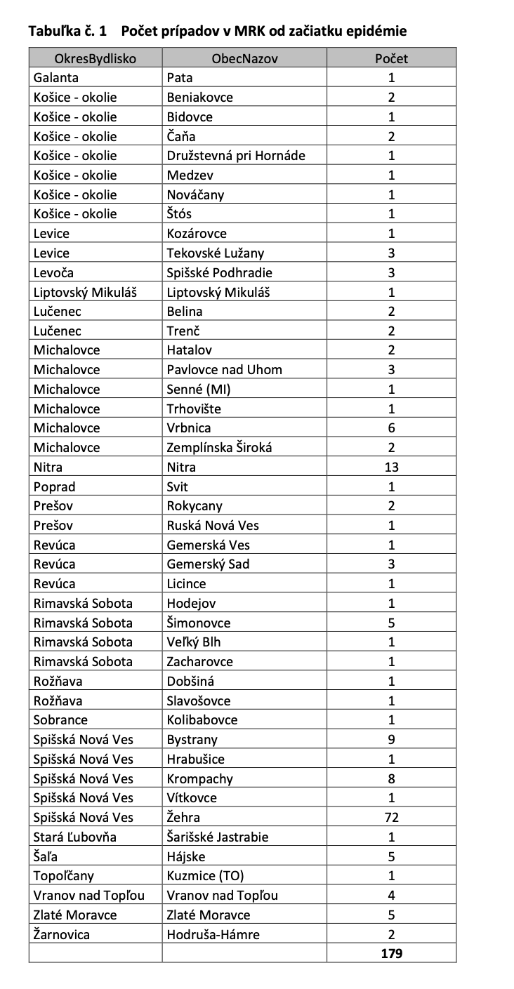 V marginalizovaných rómskych komunitách sa koronavírus vyskytol konkrétne v 179 prípadoch. Z nich sa najviac pozitívnych vyskytlo v Žehre, Nitre a Bystranoch. V 48% prípadoch sa jednalo o importovanie nákazy a 52% priamo súviseli s importovanými prípadmi.