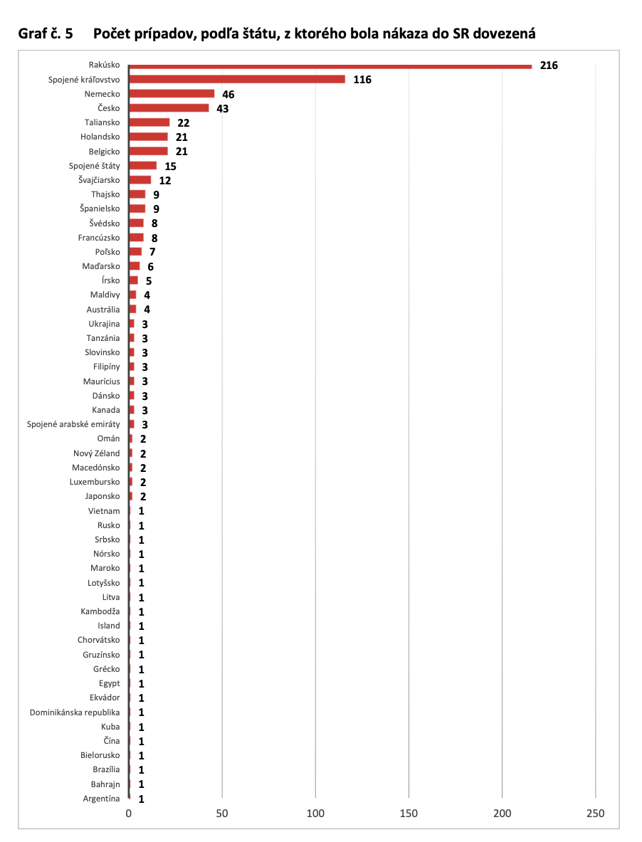 Až 37% prípadov pochádza priamo zo zahraničia z nich sa ďalších 5,7% prípadov zaznamenalo u majoritnej populácie. V marginalizovaných rómskych komunitách sa priamo importovala choroba u 5,8% z celkového počtu nakazených a až 6,3% sa nakazilo v súvislosti s ňou. Špecifickou skupinou sú Domovy sociálnych služieb, kde bolo zaznamenaných 11,6% prípadov. Bližšie nešpecifikovaných s importom je 34% nakazených. Najvačší počet pozitívnych z iných krajín je Rakúsko. Za ňou nasleduje Spojené kráľovstvo, Nemecko, Česko a Taliansko. Na importovaní ochorenia sa podielalo 52 krajín.
