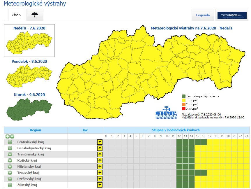 Meteorológovia vydali na nedeľu poobede výstrahu 1. stupňa pred búrkami. Tá platí od 15.00 hodiny vo všetkých krajoch okrem Trnavského a Bratislavského.