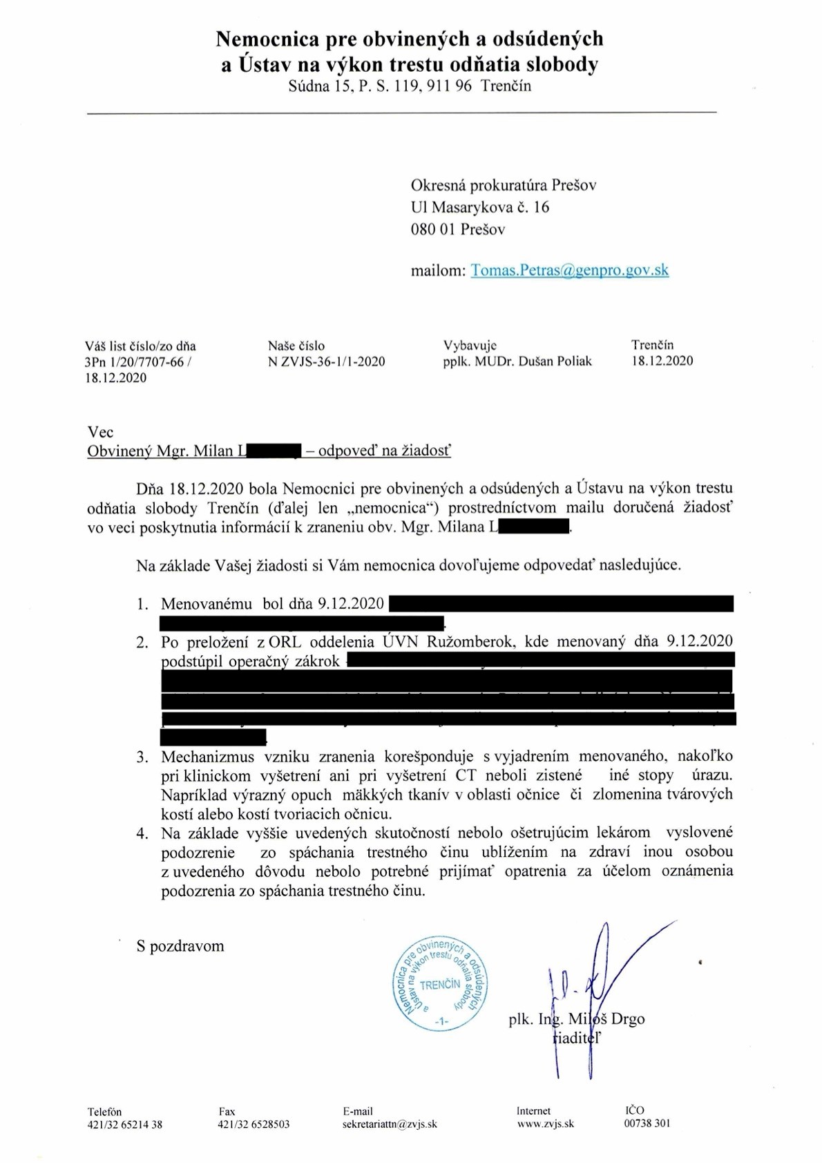Súčasťou zverejnených dokumentov je aj dokument trenčianskej nemocnice, ktorá reagovala na otázky prešovskej prokuratúry. Opisuje v ňom to, že mechanizmus zranenia korešponduje s vyjdrením Lučanského, ako sa mu úraz oka stal. "Na základe vyššie uvedených skutočností nebolo ošetrujúcim lekárom vyslovené podozrenie zo spáchania trestného činu ublížením na zdraví inou osobou z uvedeného dôvodu nebolo potrebné prijímať opatrenia za účelom oznámenia podozrenia zo spáchania trestnéo činu," uvdáza sa v dokumente.
