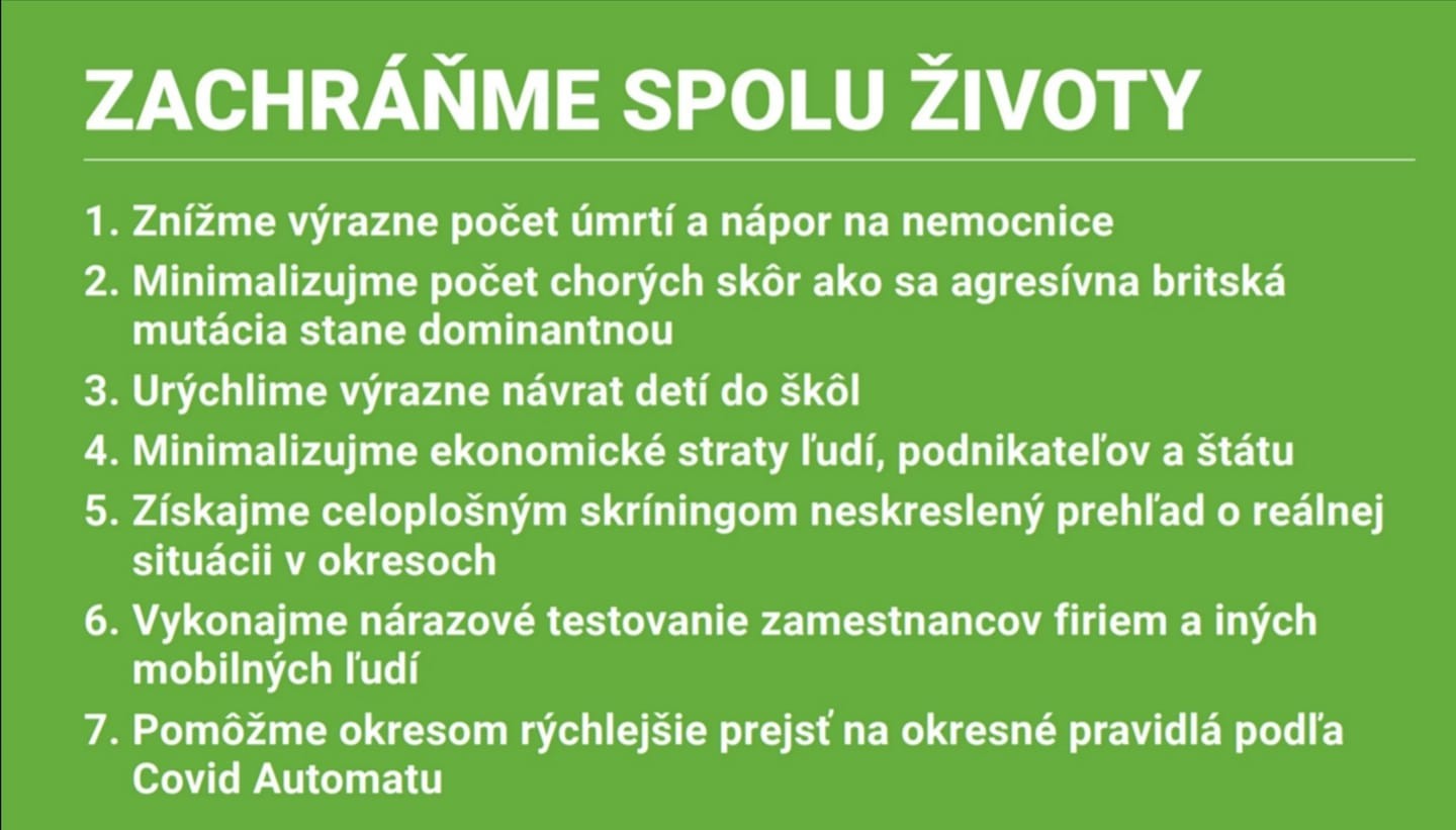 Opäť to bude forma celoplošného testovania. Negatívny test bude potrebný aj na cestu do práce či na vychádzku do prírody. Skríning by mal byť základom pre ďalšie cielené testovanie v jednotlivých okresoch. Uznesenie vlády podporili traja koaliční partneri OĽaNO, Sme rodina a SaS, strana Za ľudí bola proti. Skríning by mal podľa premiéra Igora Matoviča znížiť počet úmrtí a počet hospitalizovaných v nemocniciach. Urýchliť by sa mal aj návrat detí do škôl.