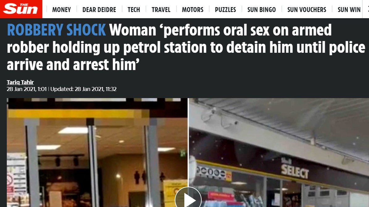 O žene z bratislavskej pumpy sa dokonca zmienil aj slávny portál mirror.co.uk. Ten zaujal takýmto titulkom: "Žena zdržala lúpežníka na benzínovej stanici, kým dorazila polícia - a to vykonaním sexuálneho aktu s ním“.