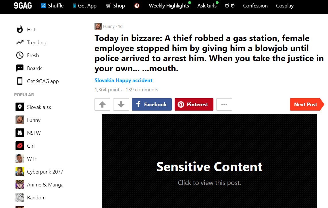 Príbeh zo slovenskej čerpačky sa dokonca dostal aj na zábavný server 9gag.com. Ten bizarný prípad z Bratislavy okomentoval slovami: "Keď vezmete spravodlivosť do vlastných...úst."