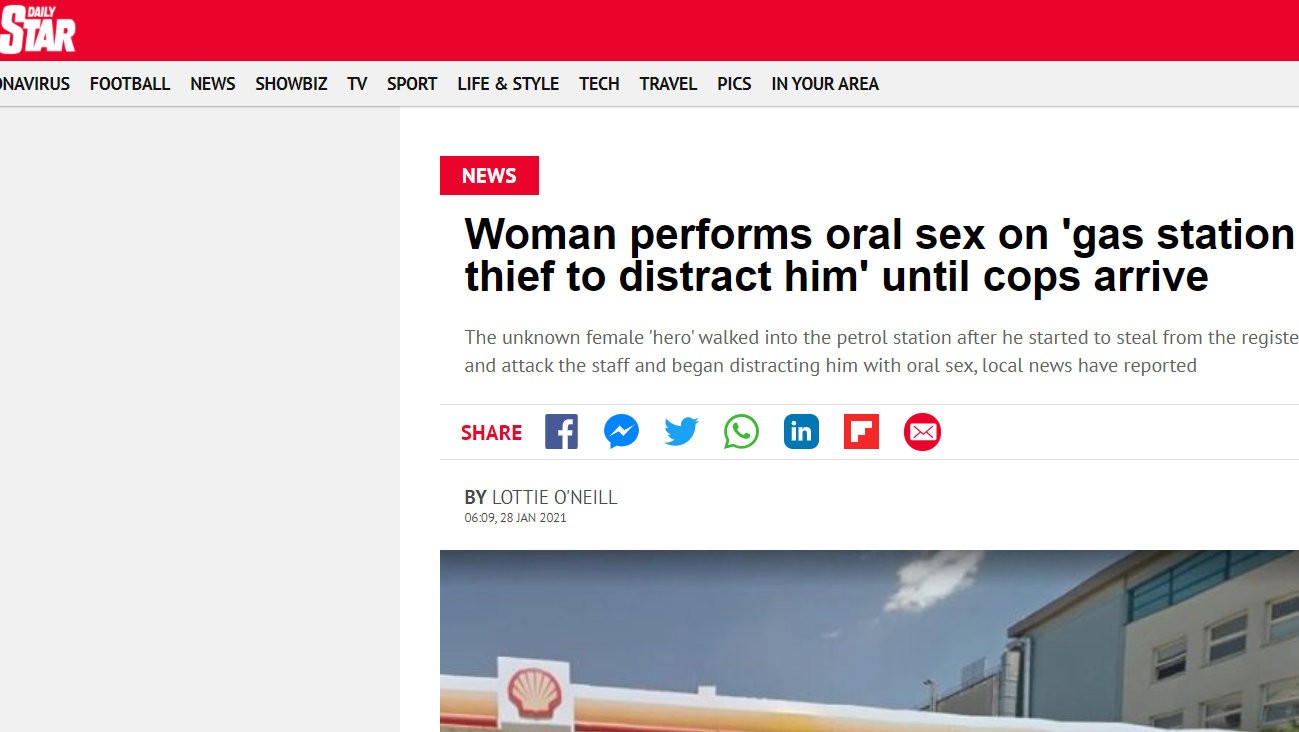 Šteklivý incident na Slovensku opísal aj portál dailystar.co.uk nasledujúcim titulkom: "Žena orálne uspokojovala lupiča na benzínovej pumpe, kým neprišli policajti."