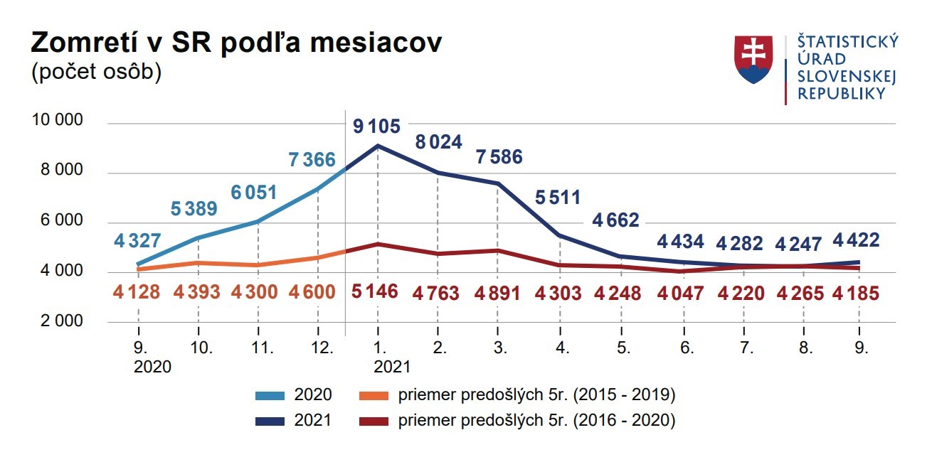 Covid-19 opäť stúpa v rebríčku najčastejších príčin úmrtí, v septembri sa posunul z dvanásteho na šieste miesto. Na Slovensku zomrelo v septembri viac ako 4 tisíc osôb, čo je po júlových a augustových číslach stále ešte tretí najnižší počet za posledných dvanásť mesiacov. "So zhoršujúcou sa epidemiologickou situáciou nastal v septembri zlom, po ôsmich mesiacoch plynulého znižovania, počet zomretých prvýkrát v tomto roku vzrástol,“ uviedla Zuzana Podmanická, riaditeľka odboru štatistiky obyvateľstva ŠÚ SR.