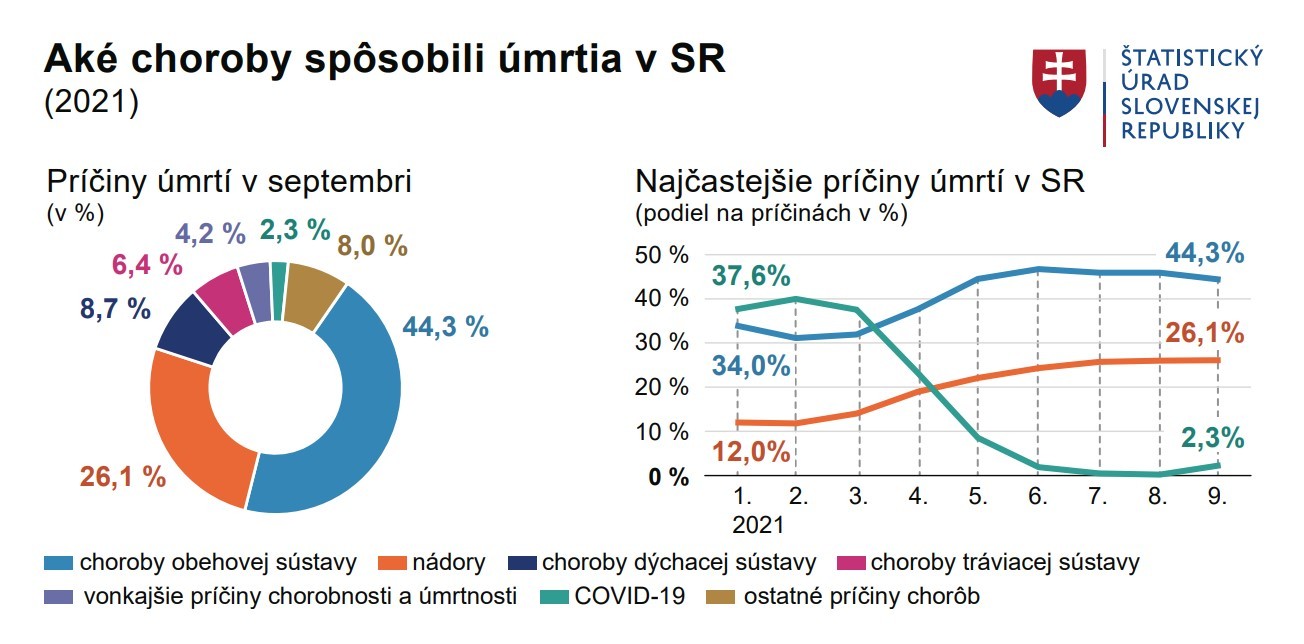 Na prvom mieste príčin úmrtí dominovali na Slovensku choroby obehovej sústavy. Zomrelo na ne v deviatom mesiaci roka 2021 takmer 2 tisíc osôb, čo je rovnako ako päťročný priemer. Tieto choroby sa na celkovom počte zomretých podieľali 44 %. Na nádory zomrelo prvýkrát v tomto roku viac ľudí ako je päťročný priemer. Treťou najčastejšou príčinou boli s podielom 9 % choroby dýchacej sústavy, pričom nadúmrtnosť oproti 5-ročnému priemeru bola najvýraznejšia zo všetkých príčin úmrtí. Prvú päťku najpočetnejších príčin úmrtí doplnili na štvrtej priečke choroby tráviacej sústavy.