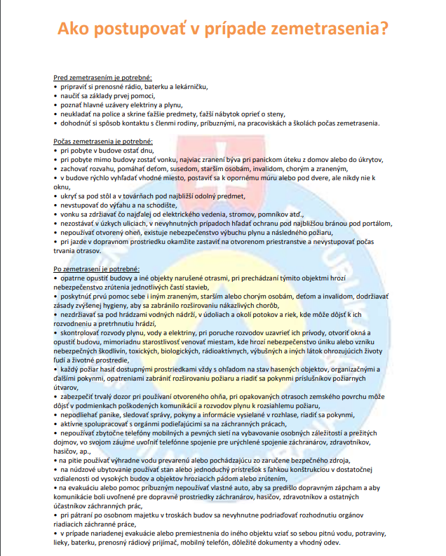 • pri pobyte mimo budovy zostať vonku, najviac zranení býva pri panickom úteku z domov alebo do úkrytov,