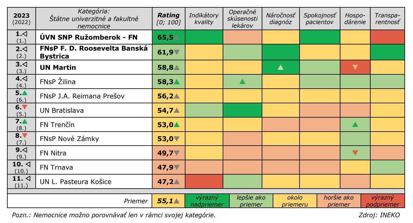 BRATISLAVA / Najlepšou štátnou univerzitnou a fakultnou nemocnicou roka sa opäť stala Ústredná vojenská nemocnica SNP Ružomberok – fakultná nemocnica. V kategórii všeobecných nemocníc obhájila prvenstvo Nemocnica Agel Košice-Šaca. Vyplýva to z deviateho ročníka hodnotenia nemocníc Inštitútu pre ekonomické a sociálne reformy (INEKO), ktoré je založené na porovnávaní dát predovšetkým z rokov 2019 až 2022.
