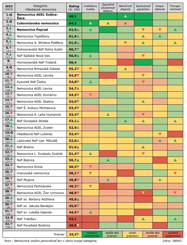 Čo sa týka všeobecných nemocníc, najlepšie obstála už piatykrát po sebe Nemocnica v Košiciach-Šaci. Nemocnice z východného Slovenska obsadili aj ďalšie pozície na stupni víťazov. Ľubovnianska bola druhá, Nemocnica Poprad tretia. Na poslednom mieste sa umiestnila Nemocnica s poliklinikou Považská Bystrica. Tí sa vyjadria až po dôkladnom preštudovaní výsledkov.