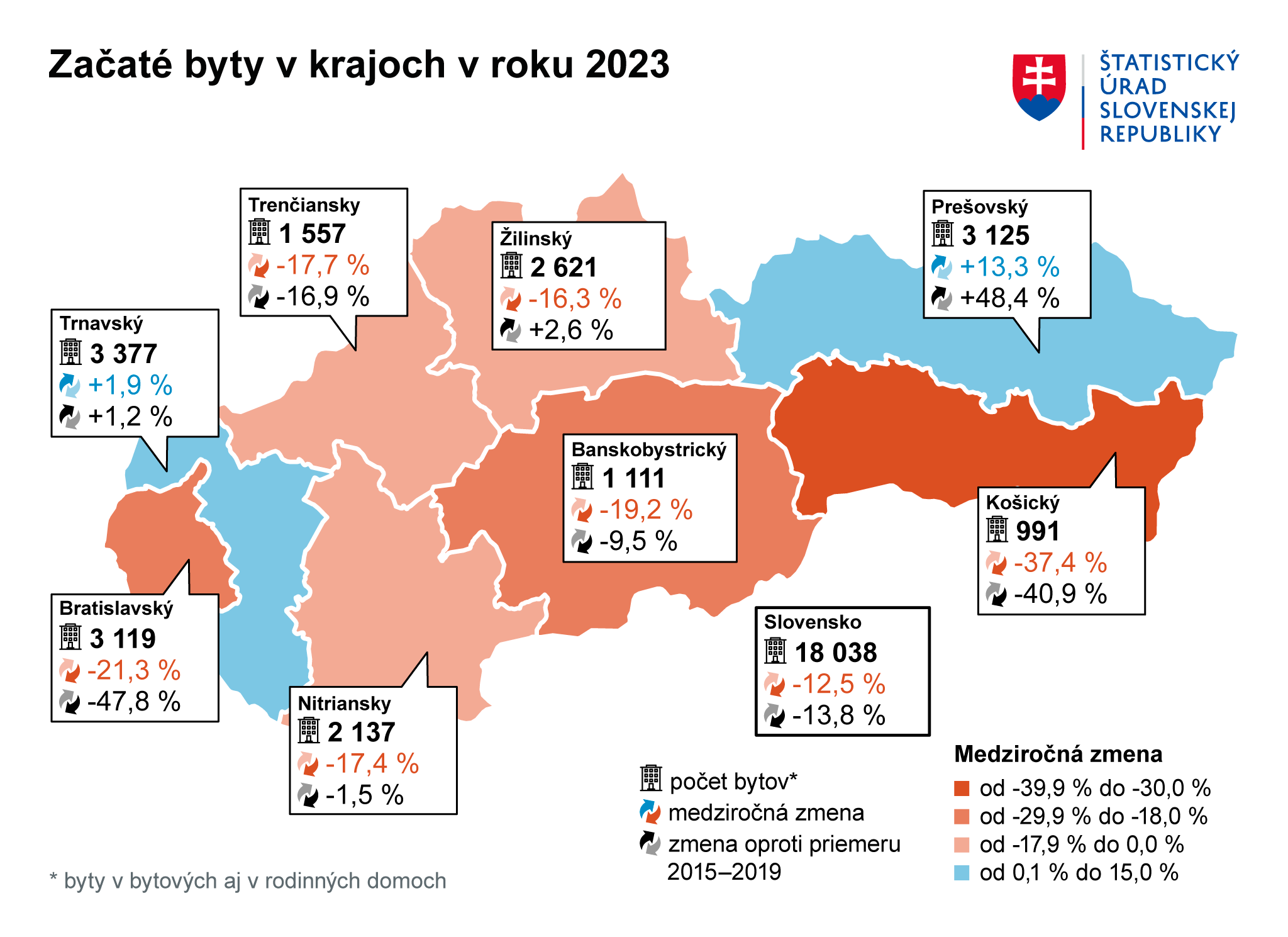Súčasne v roku 2023 pokračovalo zaostávanie rozbehu výstavby. Začalo sa stavať len 18-tisíc nových bytov, o 13 percent menej ako v roku 2022. Trend spomalenia vydávania stavebných povolení sa prejavil naprieč regiónmi Slovenska, pričom v Košickom kraji bol prepad do 40 percent a v piatich ďalších do 22 percent. Začiatok výstavby výraznejšie zrýchlil len v Prešovskom kraji.