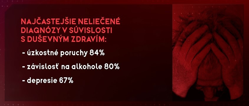 Najčastejšie zostávajú neliečené úzkostné poruchy, závislosť na alkohole a depresie. Následkom môže byť samovražda. "Takmer pätina obyvateľov na Slovensku buď trpí alebo žije v domácnosti s niekým, kto trpí duševnou poruchou," informoval Róbert Babeľa, prorektor pre vedu a výskum na SZU v Bratislave. Podľa oficiálnych štatistík za posledných 22 rokov na Slovensku spáchalo samovraždu niečo okolo 12-tisíc ľudí, čo je pre porovnanie taký istý počet ako je počet obyvateľov miest Revúca či Stupava.