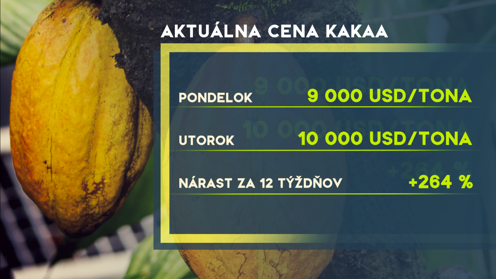 Na svetových trhoch drahšie ako meď a novým luxusom sa stalo kakao. Láme jeden rekord za druhým a v utorok sa vyšplhalo cez 10 tisíc dolárov za tonu. "Za posledných 12 mesiacov vzrástla cena kakaa o 264 percent," potvrdil nárast aj analytik Slovenskej sporiteľne Marián Kočiš.