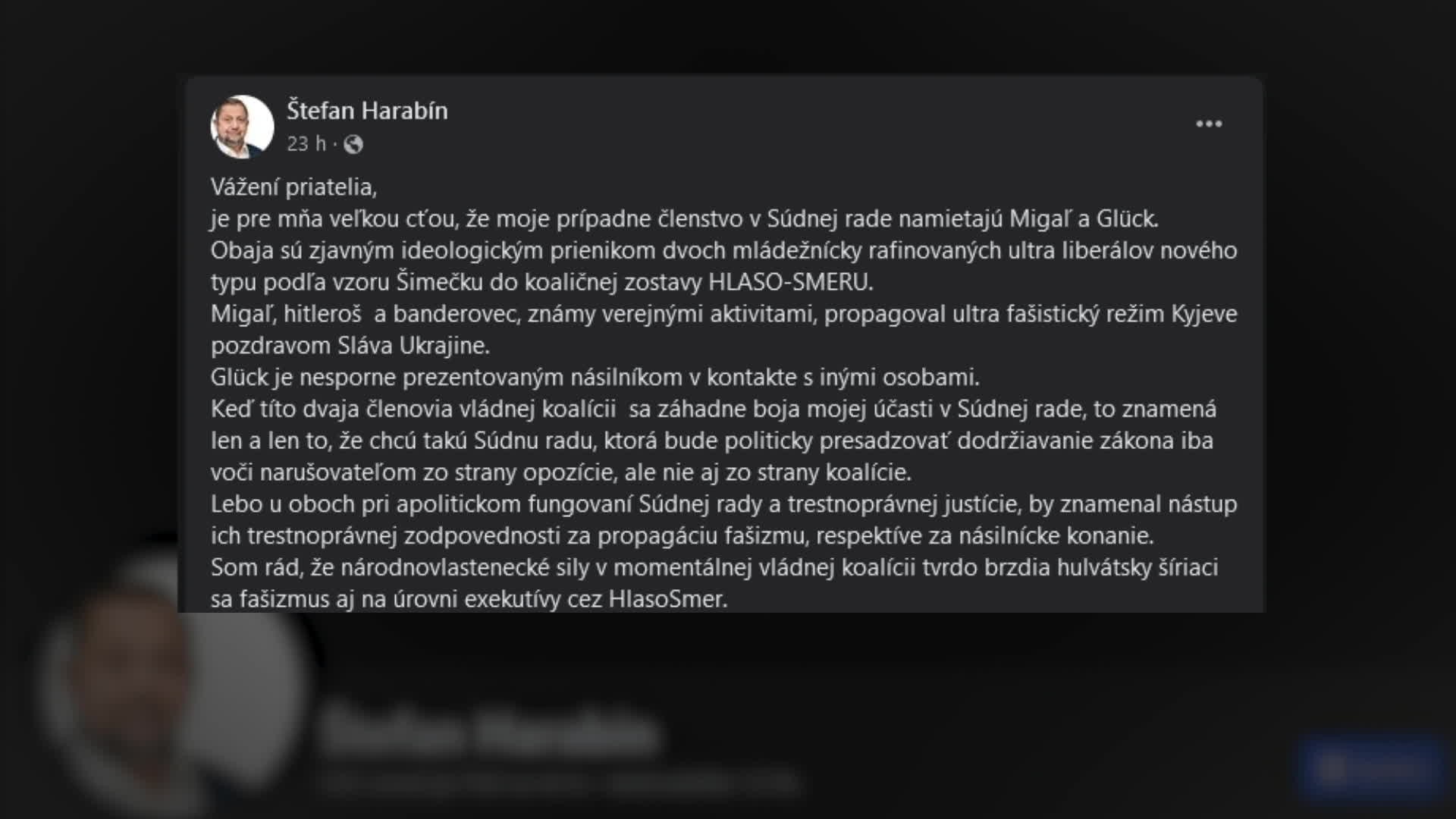 "Keď títo dvaja členovia vládnej koalície sa záhadne boja mojej účasti v Súdnej rade, to znamená len a len to, že chcú takú Súdnu radu, ktorá bude politicky presadzovať dodržiavanie zákona iba voči narušovateľom zo strany opozície, ale nie aj zo strany koalície," uviedol Harabin na sociálnej sieti.