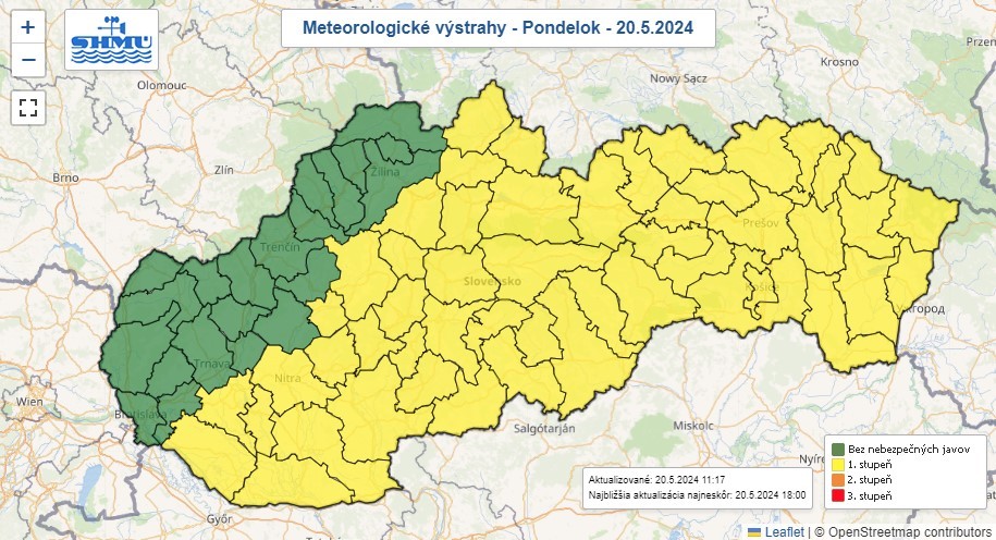 BRATISLAVA / Na väčšine Slovenska s výnimkou Bratislavského kraja sa môžu v pondelok (20. 5.) vyskytnúť búrky. Upozorňuje na to Slovenský hydrometeorologický ústav (SHMÚ), ktorý v tejto súvislosti vydal výstrahy prvého stupňa.