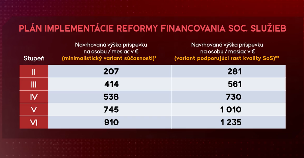 Príspevok sa má navýšiť v každej skupine odkázanosti. Smerodajný bude stav opatrovaného. V najvyššom stupni odkázanosti môže ísť o sumu viac ako 1200 eur. Konkrétne prerozdelenie financovania rezort zatiaľ nepriblížil. "Na tejto reforme pracuje skupina, ktorá je zložená zo zamestnancov rezortu, ale aj z ďalších organizácií, ktoré sa starajú o odkázaných ľudí," povedal Erik Tomáš, minister práce, sociálnych vecí a rodiny.