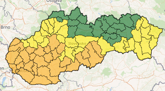 Výstrahy druhého stupňa platia pre celý Bratislavský, Trnavský a Nitriansky kraj, pre väčšinu okresov Banskobystrického kraja a okresy Partizánske a Prievidza. Teplota sa tam môže ojedinele vyšplhať na 35 stupňov Celzia.