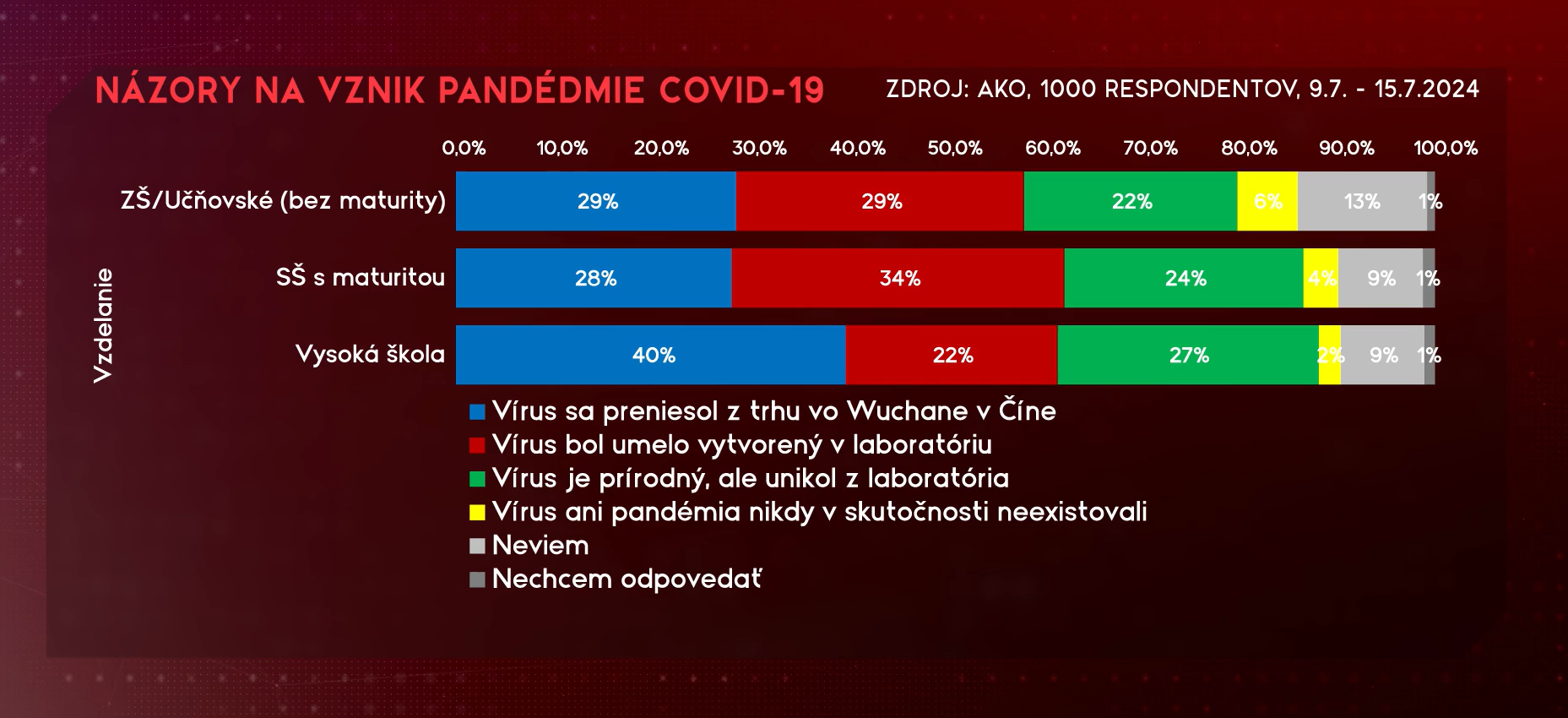 Zaujímavým výsledkom prieskumu je, že 4 % opýtaných si myslia, že vírus ani pandémia neexistujú. Tento názor zastávajú najmä mladší ľudia, ktorí sú viac vystavení dezinformáciám zo sociálnych sietí. "Staršia populácia neverí, že to prišlo z trhoviska. Ten vyšší vek sa viac prikláňa tomu, že to bolo umelo vytvorené," ozrejmil Václav Hřích z agentúry AKO.