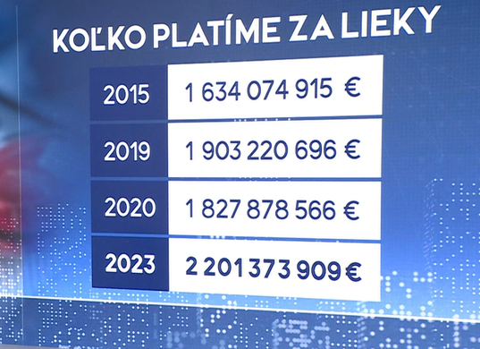 V roku 2015 sme za lieky zaplatili čosi viac ako miliardu šesťsto miliónov eur, každý ďalší rok to bolo viac, s výnimkou covidového roka 2020. Vlani to už bolo o asi šesťsto miliónov viac - dve miliardy dvesto miliónov. Sú v tom zarátané doplatky za recepty a voľno predajné lieky.