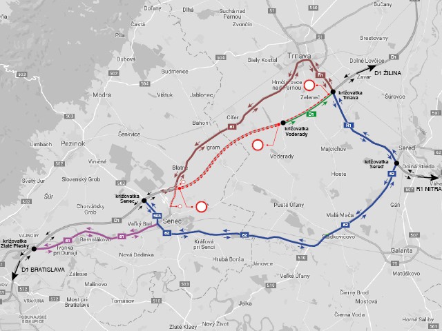 Polícia odporúča vodičom využiť obchádzkové trasy, ktoré sú uvedené na obrázku (I/61, R1):