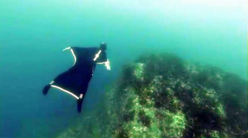 Nový neoprenový oblek priamo pod vodou predstavil rekordman vo voľnom potápaní Pierre Frolla. Vznáša sa pod morskou hladinou a tvarom i pohybmi napodobňuje vlastne podmorskú mantu dvojrohú - najväčšiu raju.