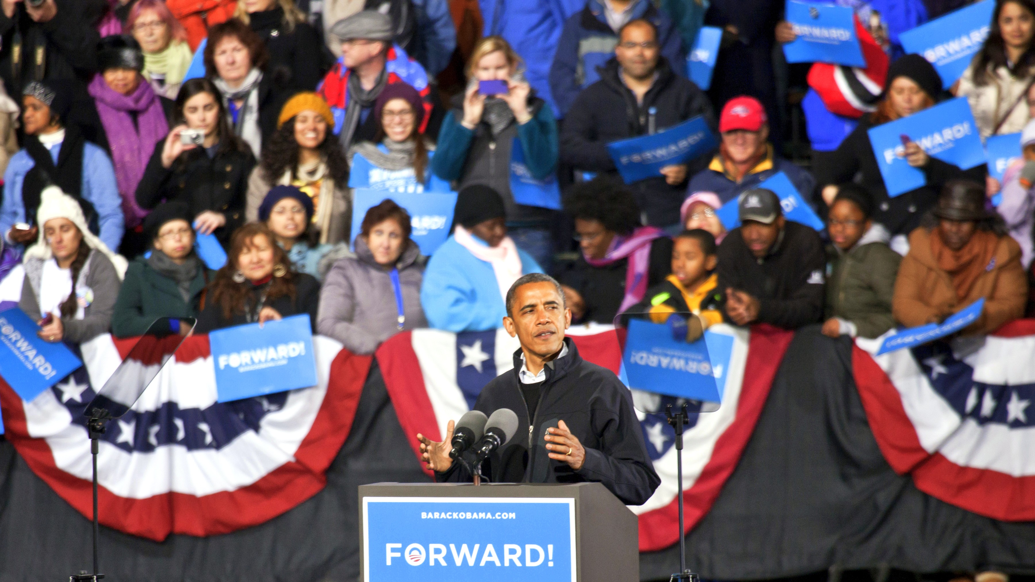 V roku 2008 slávilo Obamovo víťazstvo pod šírym nebom v Chicagu okolo 200 tisíc. Panovala elektrizujúca atmosféra, prvýkrát sa totiž prezidentom stal muž tmavej pleti. Tento rok sa prípadná oslava znovuzvolenia uskutoční v McCormick Centre, kde nebude ani desatina počtu ľudí z roku 2008.