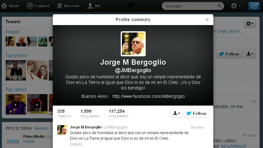O tom, že zrejme budeme mať dočinenie s pokrokovým pápežom svedčí aj to, že krátko po svojom zvolení sa na Twitteri objavil už aj prvý - údajne jeho tweet s jednoduchým textom: HABEMUS PAPAM FRANCISCUM (Máme pápeža Františka). František sa nerád vozí limuzínou, preferuje dopravu autobusom.