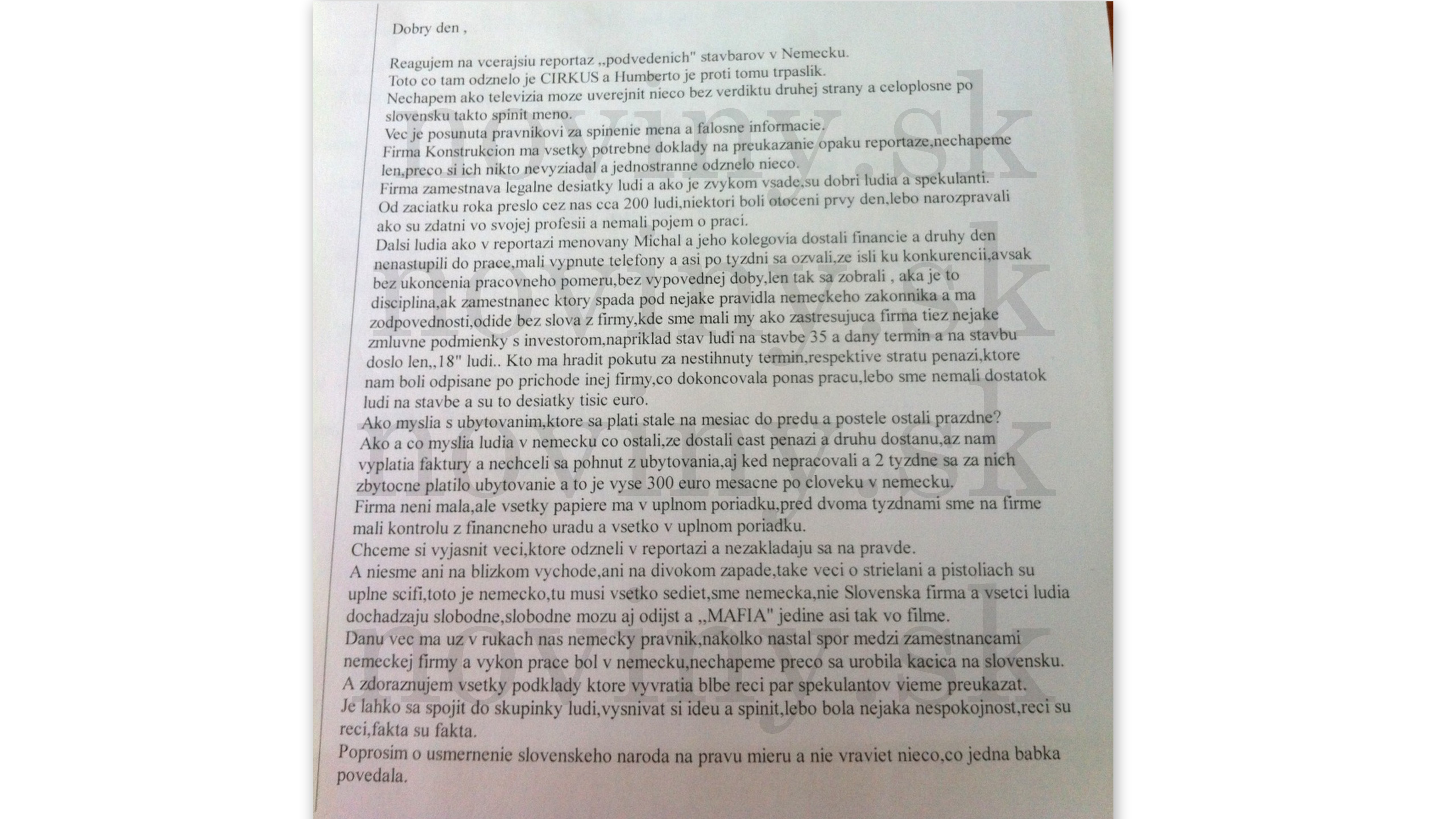 Do redakcie sa nám ozývajú prostredníctvom e-mailu zástupcovia spomínanej firmy. Firma tvrdí, že muži nedostali peniaze aj preto, lebo prestali v istom okamihu pracovať, nezaplatili za ubytovanie a všetky peniaze, ktoré ich zamestnanci majú dostať, tie aj dostanú. Čo je však na tom pravdy?