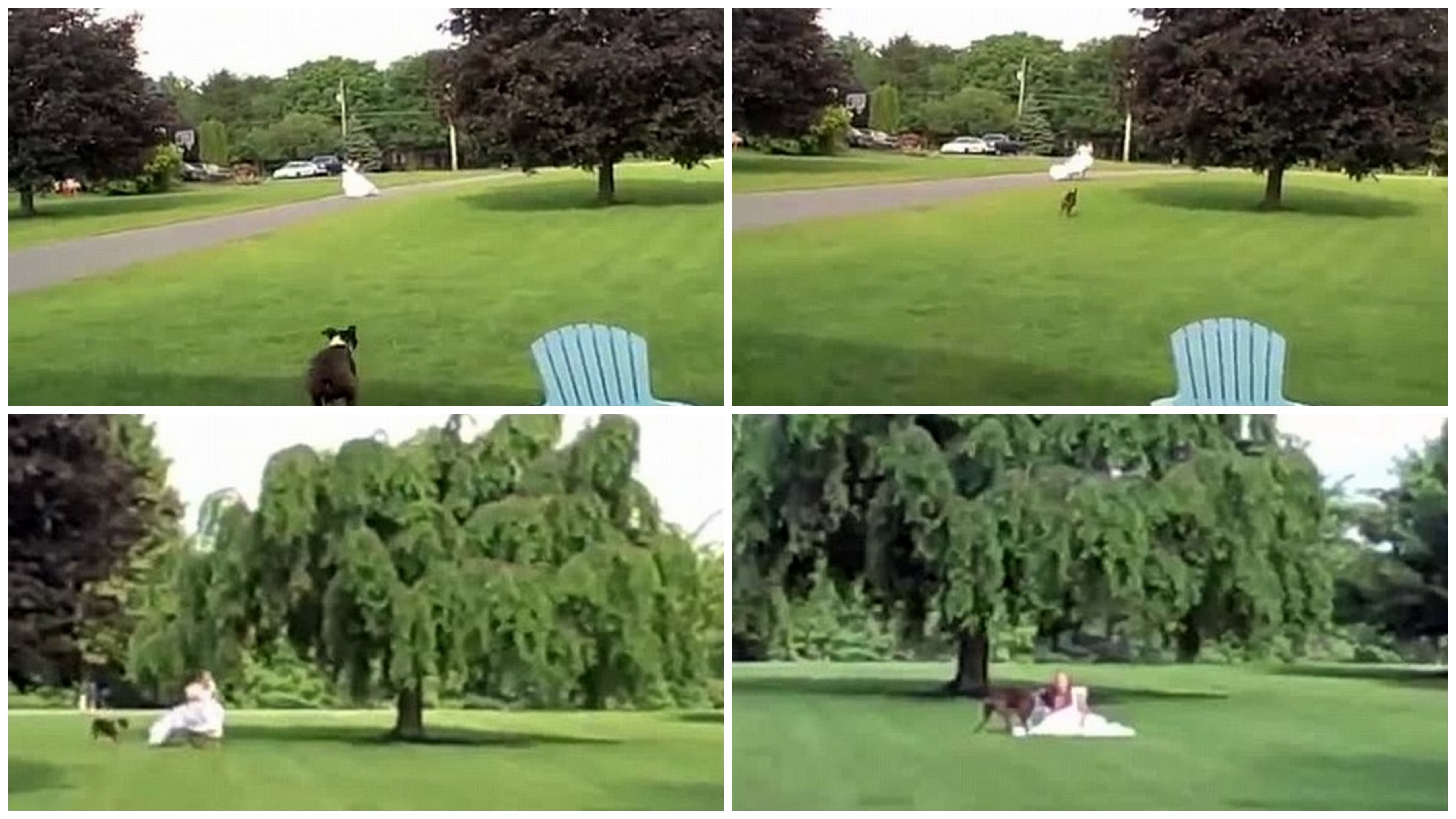 Žena však nahodila v takých bohatých šatách prekvapivú rýchlosť. Psíkovi však neutiekla. Na videu vidno, ako padá k zemi a pes po nej skáče, nehľadiac na biele šaty. Vtedy kamery vypína a počuť, ako autorka videa zhrozene vstupuje na scénu.
