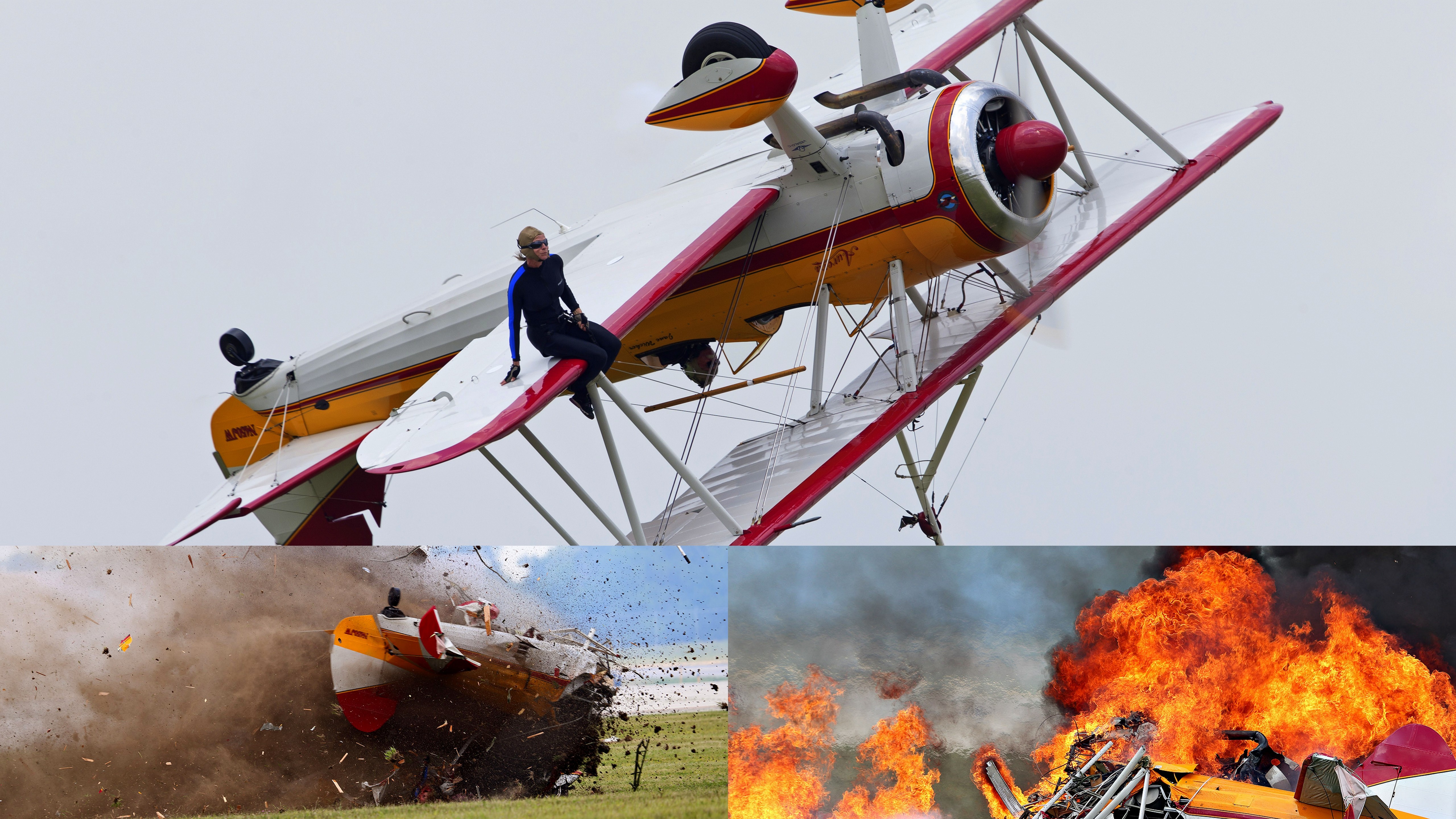 Podľa internetového vydania denníka USA Today sú obeťami kaskadérka Jane Wickerová a pilot Charlie Schwenker. Na amatérskom videozázname je vidno, ako sa lietadlo pri predvádzacom manévri otočilo hore podvozkom a kaskadérka sedela na jeho krídle. Následne sa stroj naklonil a zrútil sa na zem, pričom explodoval a miesto dopadu zachvátili plamene.