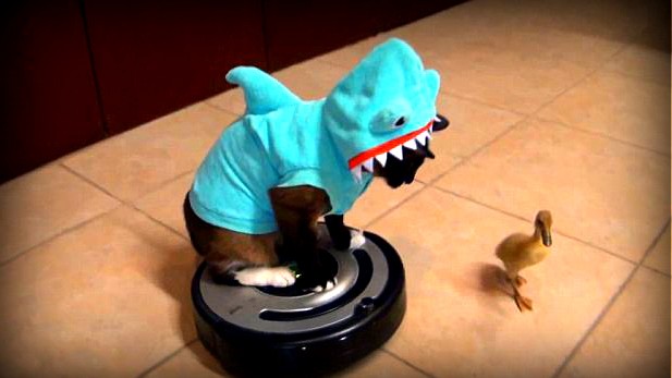 Dosiahol takmer tri milióny videní, svetlo sveta tak uzrel nový frajer - mačka Max-Arthur. Tej totiž vôbec nevadí, že si s ňou robotický vysávač robí, čo chce, že jazdí hore dolu po podlahe, vráža do vecí... Aspoň si zajazdí a niekto iný sa zaň pohybuje. Ani, že je navlečená do kostýmu žraloka. Pred vysavačom navyše uháňa ako o život aj malé káčatko a napokon ďalší vrchol videa je pitbull rovnako v kostýme žraloka.