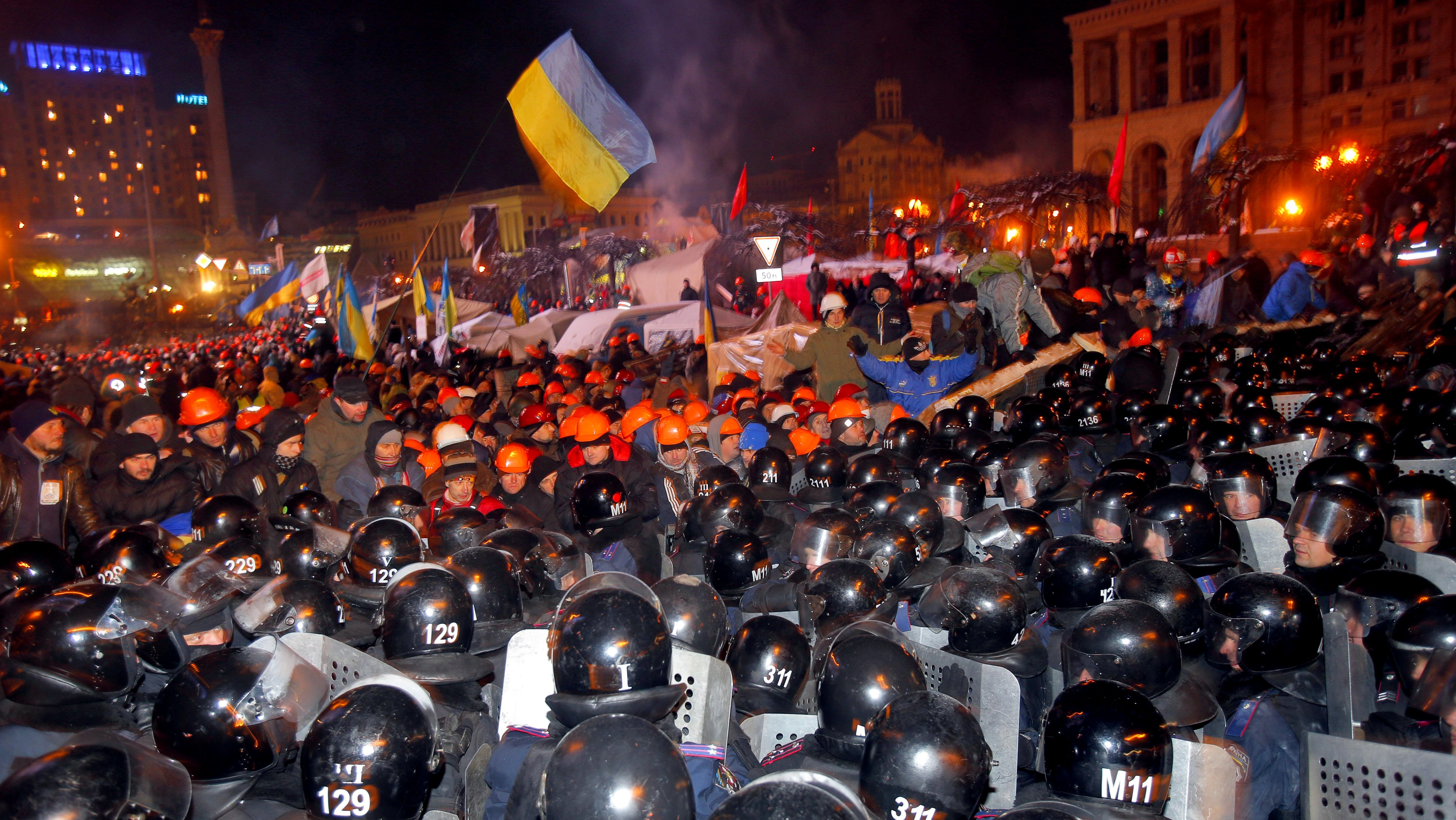 Ľudia na námestí namiesto sviečok mávajú mobilnými telefónmi a spievajú ukrajinskú hymnu. Hovorcovia z pódia vyzývajú policajtov, aby neposlúchali rozkazy a pridali sa k opozícii. "Neubližujte nám," skanduje dav, ku ktorému sa megafónom podľa Reuters pridala ukrajinská popová speváčka Ruslana.