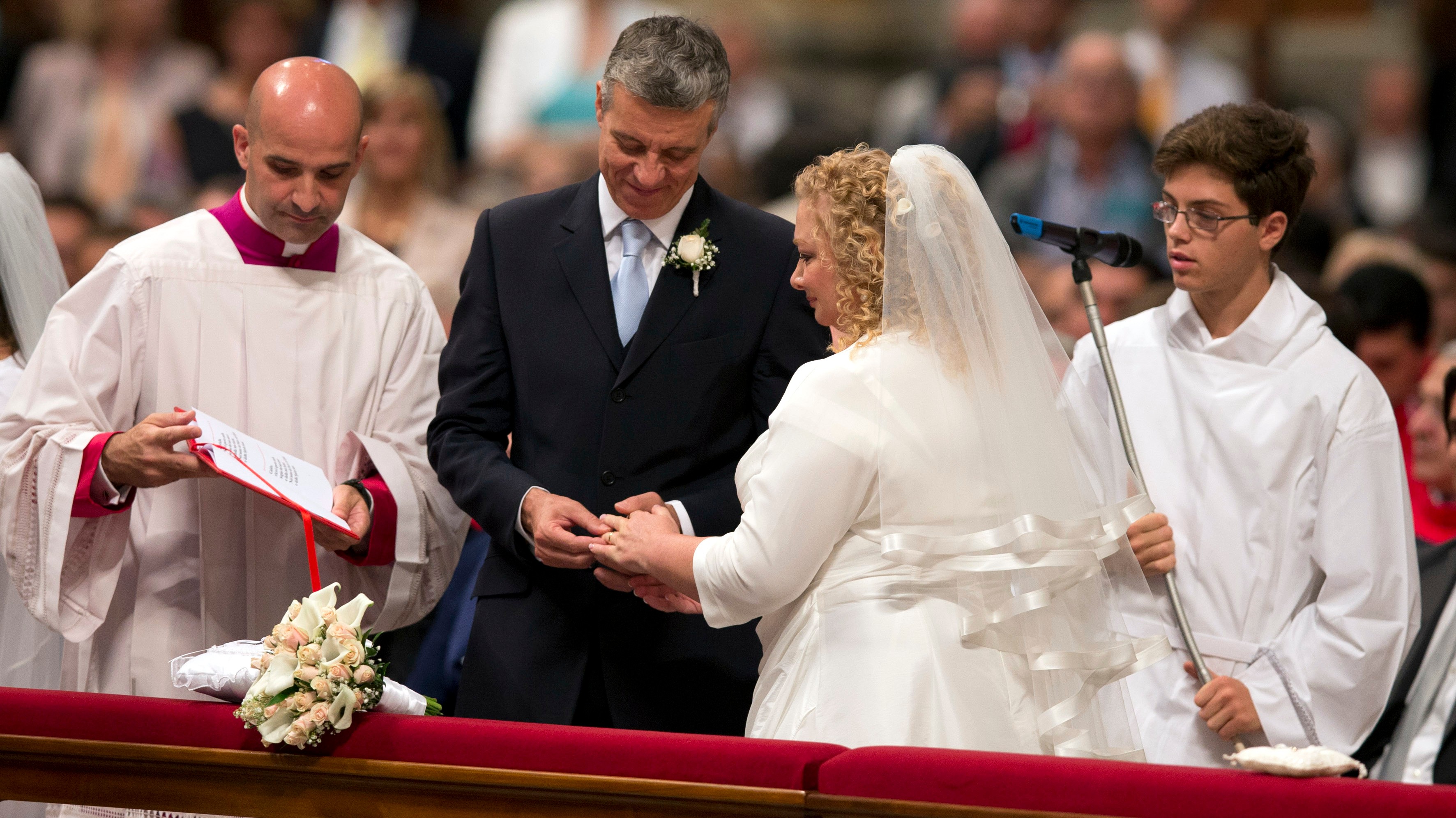 Ženíchovi z jedného páru cirkev najskôr zväzok zrušila. Jeho vyvolená má z predošlého vzťahu dcéru, ktorú porodila mimo manželstva. Pápež sobášil aj pár, v ktorom je jeden z partnerov rozvedený.