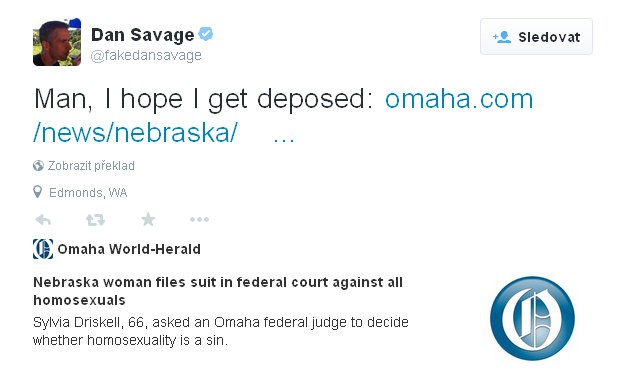 NEBRASKA / Žena z americkej Nebrasky Sylvia Driskell žaluje každého geja na Zemi. Žiada federálny súd, aby rozhodol, či je homosexualita hriech. Vo svojej žalobe neargumentuje právom, bibliou.