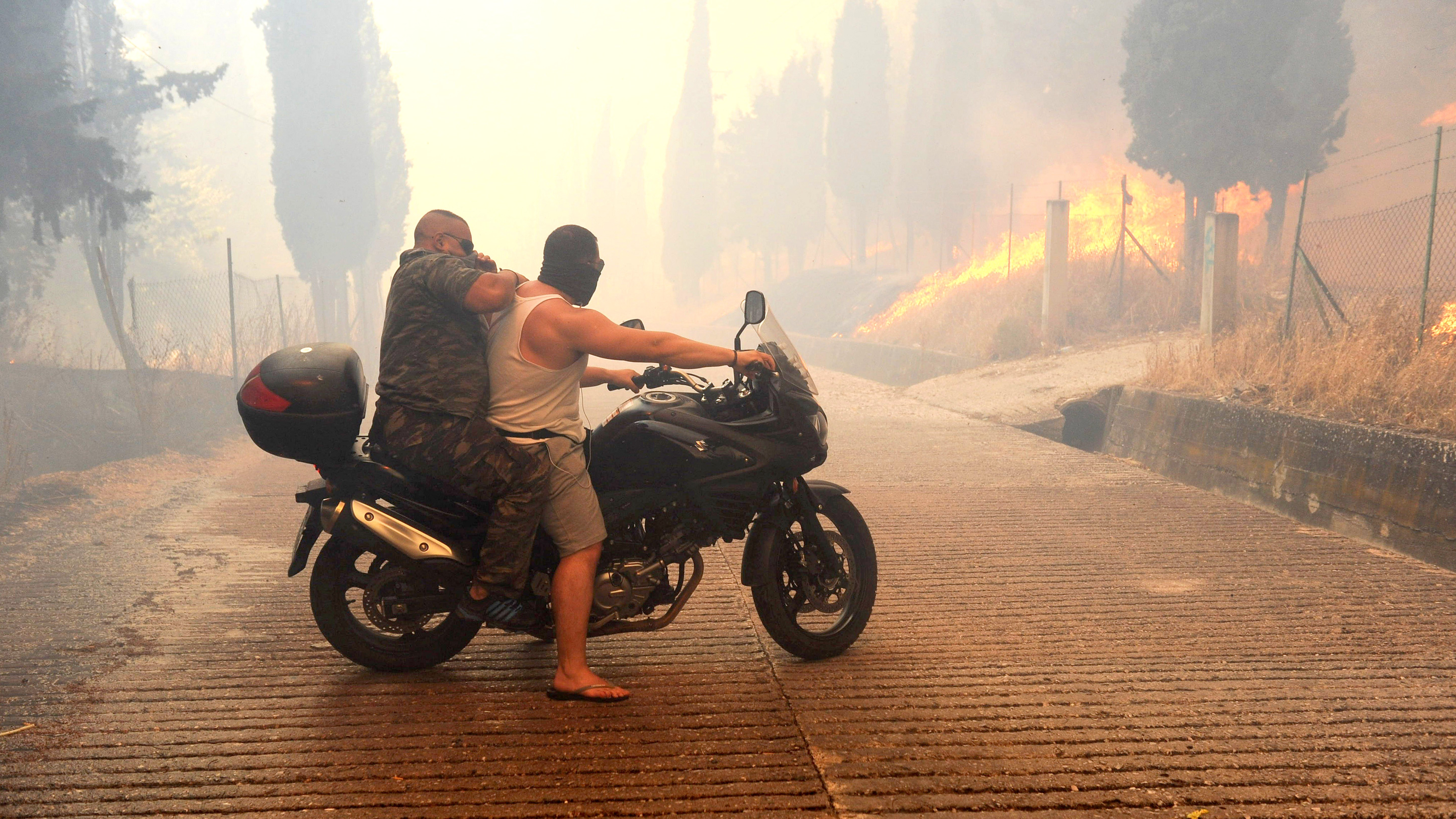 Dvaja muži odchádzajú pred hustými plameňmi z Atén: