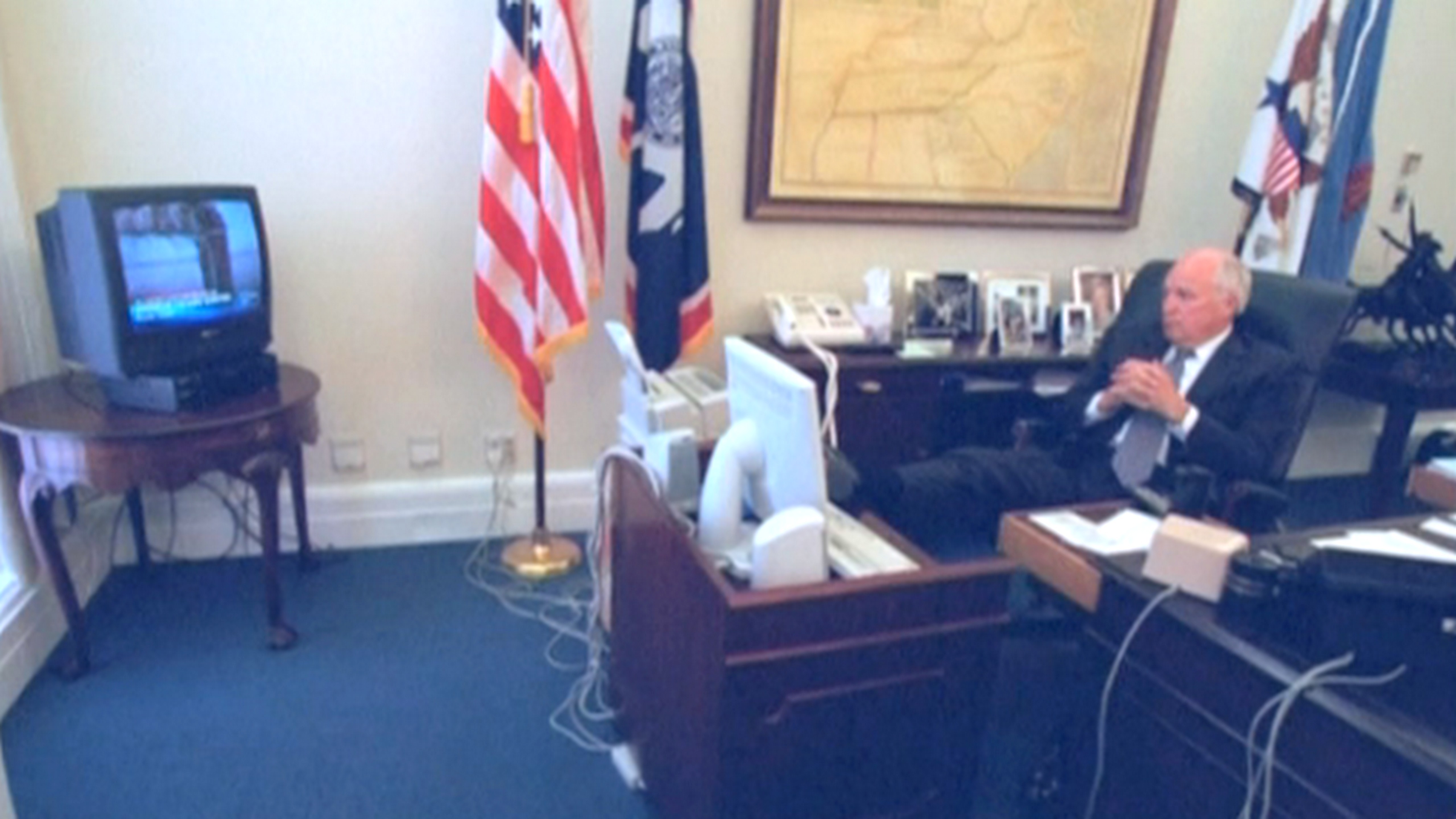Viceprezident Dick Cheney pôsobil kľudne. Vo svojej pracovni pozeral spravodajstvo z New Yorku s nohami vyloženými na stole: