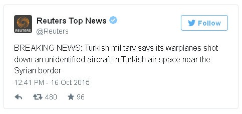 Informáciu o zostrelení lietadla tureckými vzdušnými silami zverejnila agentúra Reuters. Išlo diaľkovo riadený stroj bez posádky.
