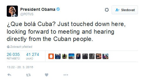 "Ako sa máš, Kuba?," napísal španielsky v kubánskom dialekte na svoj Twitter Barack Obama po zosadnutí stroja. "Práve sme tu pristáli, tešíme sa na stretnutie a na to, keď si vypočujem priamo kubánsky ľud," pokračoval prezident v anglickom jazyku.