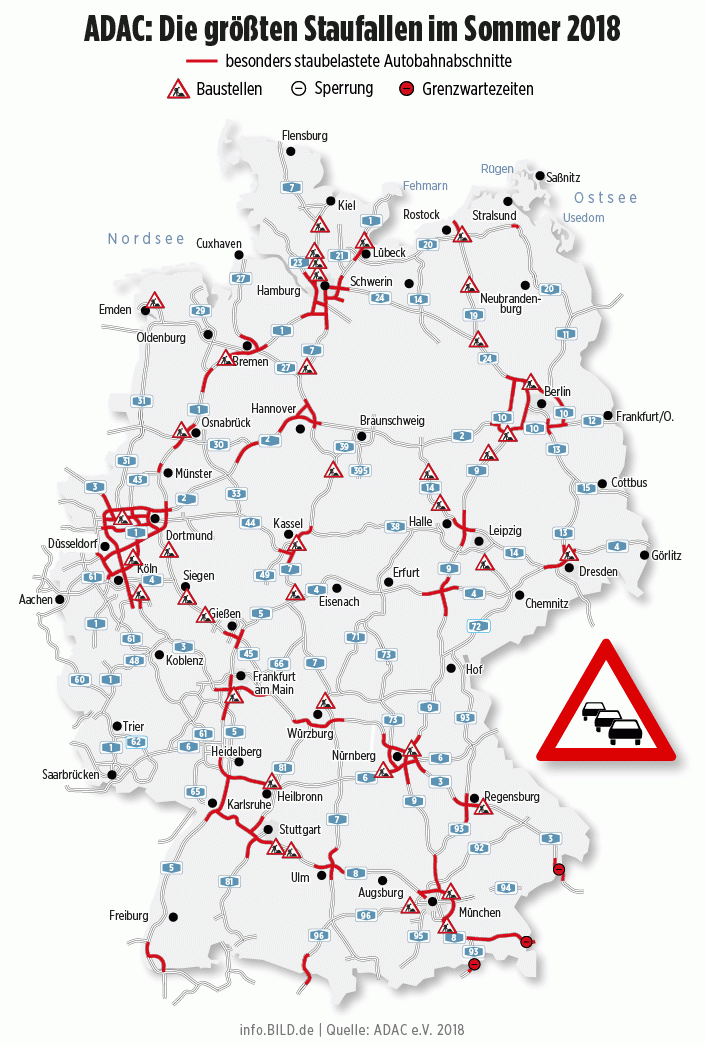 Dopravnému kolapsu prispel aj začiatok prázdnin v dvoch nemeckých spolkových krajinách: Bavorsku a Bádensko-Württembersku. Nervy otestoval úsek smerujúci z Mníchova k rakúskym hraniciam. Nemecký ADAC zverejnil mapu kritických úsekov po celej krajine.