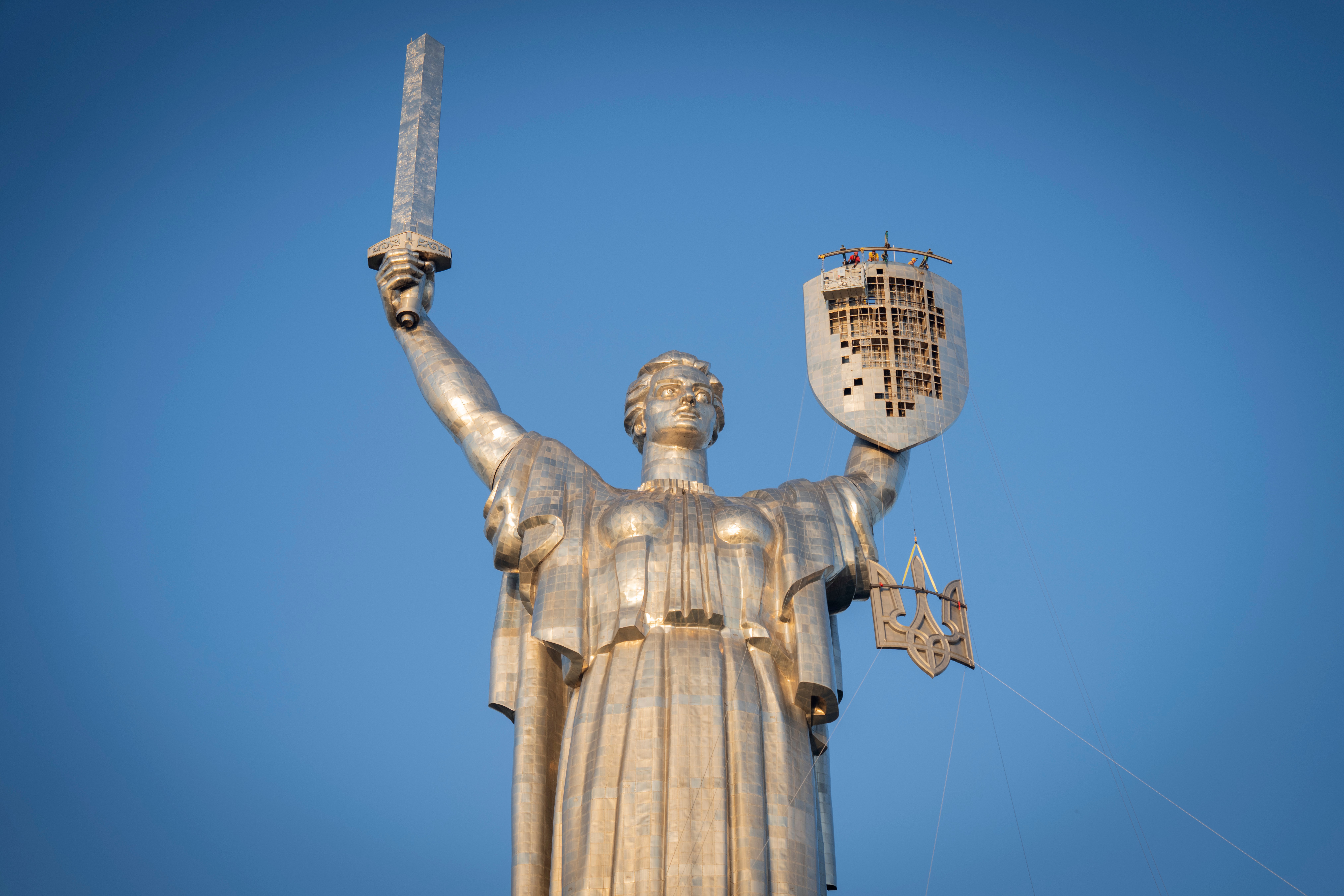 Na štít sochy Matka Vlasť v Kyjeve umiestnili ukrajinský znak - trojzubec