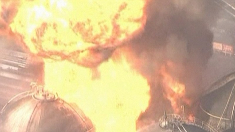 Petrochemickým komplexom v meste Sendai zatriasla obrovská explózia. Zo závodu stúpajú k nočnej oblohe obrovské jazyky oranžových plameňov. Plamene zachvátili aj ropnú rafinériu Cosmo v meste Iičihara neďaleko Tokia. Zemetrasenie spôsobilo prerušenie v japonskom priemysle.