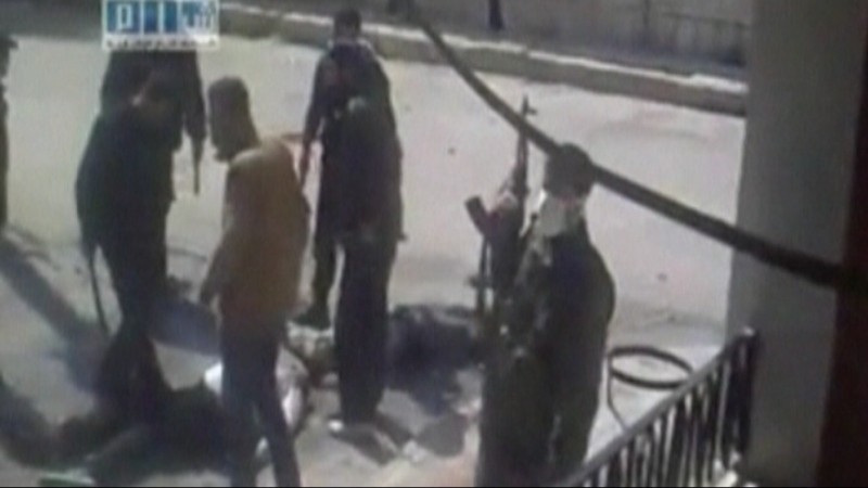 Tvrdé rany obuškami dostávajú dvaja demonštranti ležiaci na zemi. Bitka sa odohráva v meste Dará v Sýrii.