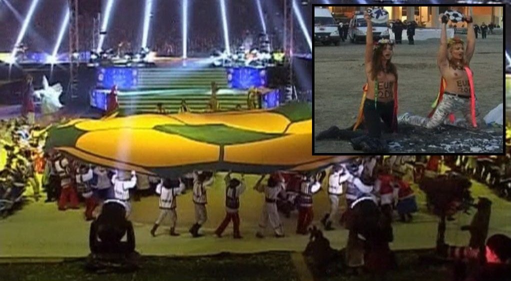 Pred vynoveným futbalovým štadiónom si však ľudia nemohli nevšimnúť aktivistky známeho hnutia Femen. Tentoraz sa dievčence vyzliekli na protest proti honosným oslavám, pretože štadión nie je úplne dokončený.