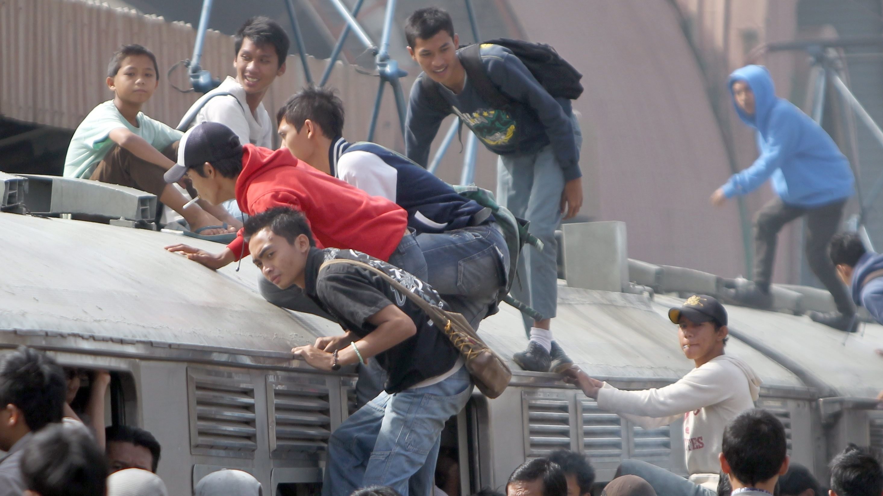 Vlaky križujúce Indonéziu po zanedbaných tratiach, ktoré za sebou zanechali v šesťdesiatych rokoch holandskí kolonizátori, sú v dopravnej špičke obzvlášť preplnené. Stovky cestujúcich sa v snahe uniknúť tlačenici, uvelebia na streche železničných súprav. Medzi "surfermi" je mnoho notorických neplatičov. Mládež zase túto formu jazdy považuje za zaujímavú adrenalínovú zábavu.