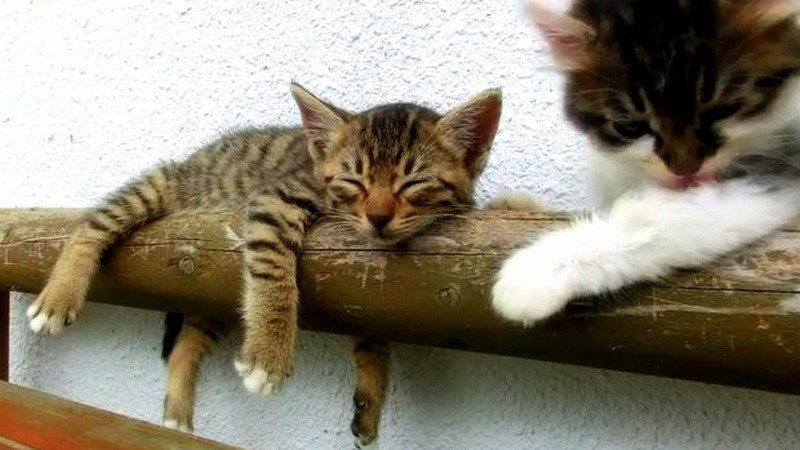 V priebehu minúty zachytil, čo sa súrodenec spiaceho mačiatka snažil spraviť preto, aby bračeka (sestričku) zobudil. Hryzenie ucha, chvosta, šťuchanie do labiek, no nič z toho nepomohlo. Napokon nemotorne z lavičky niekoľkokrát padne, aby nakoniec zaspalo v neuveriteľne smiešnej pozícii... Pozrite sa!