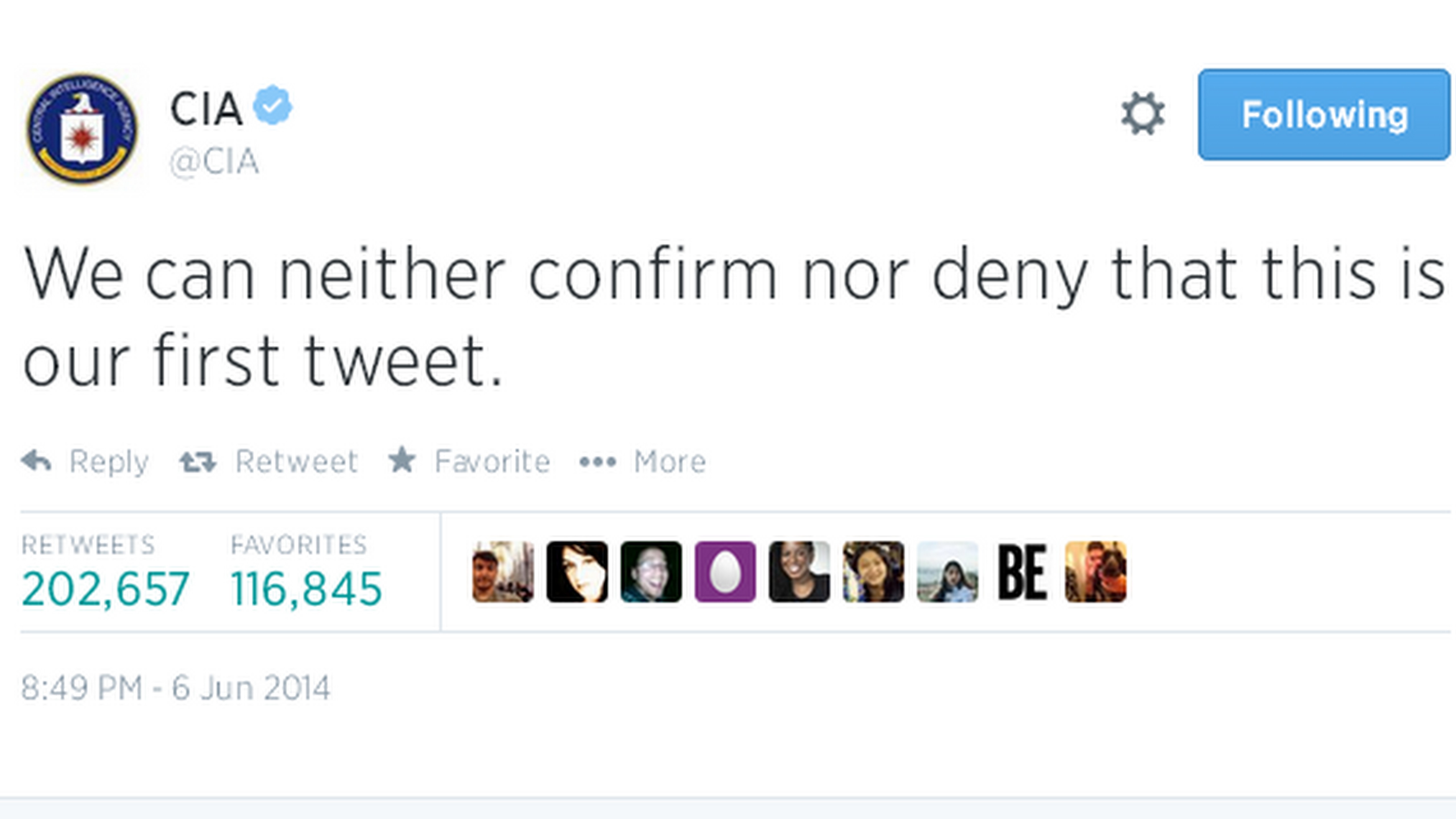 "Nemôžeme potvrdiť ani poprieť, že toto je náš prvý tweet," uviedla CIA na Twitteri. Napriek tomu si stránka okamžite získala množstvo fanúšikov. Počas prvej hodiny začalo agentúru sledovať viac ako 82 tisíc ľudí, píše The Wall Street Journal.