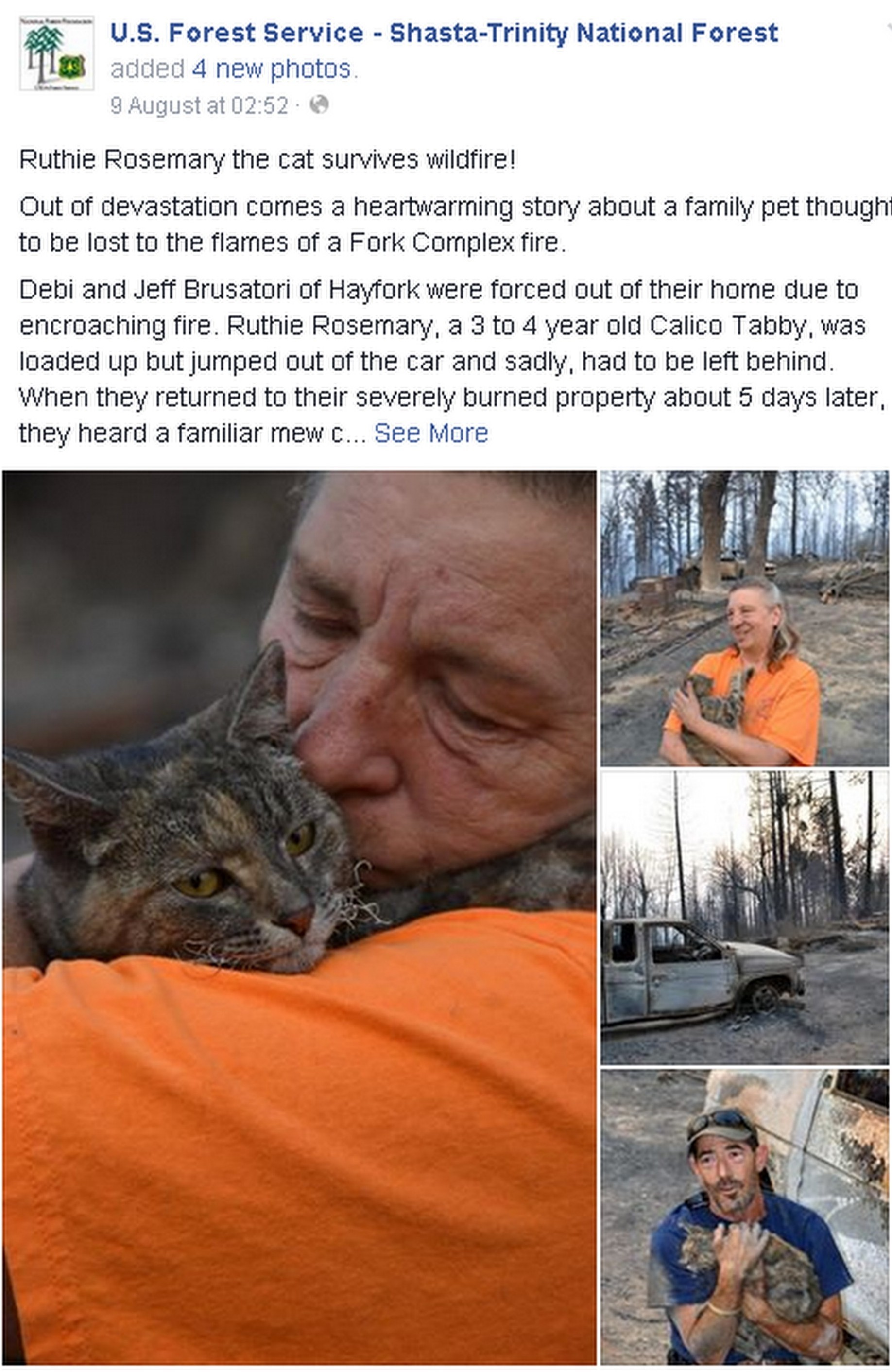 Príbeh zverejnila na sociálnej sieti Facebook miestna lesná služba. Jeff Brusatori je totiž dobrovoľným hasičom, ktorý s mohutným ohňom v oblasti bojoval.