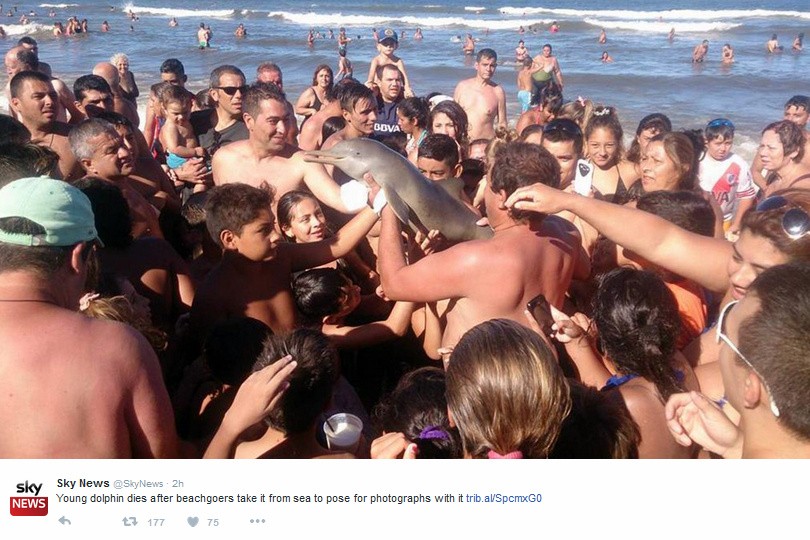 Na pláži v Argentíne zomrel mladý delfín, turisti si s ním robili selfie