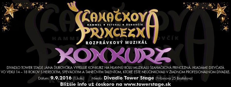 Ján Ďurovčík a Divadlo Tower Stage hľadá novú Šľahačkovú princeznú do prvého rozprávkového muzikálu na svojich doskách. Dievčatá vo veku približne 14 až 18 rokov s hereckým speváckym a tanečným talentom budú môcť spolupracovať s profesionálnymi umelcami a uviesť tak legendárnu rozprávku z dielne Pavla Hammela a Kamila Peteraja.