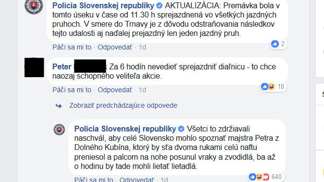 Peter medzi komentáre napísal: "Za 6 hodín nevedieť sprejazdniť diaľnicu - to chce naozaj schopného veliteľa akcie". Administrátor stránky mu onedlho odpísal komentárom, ktorý si vyslúžil stovky "lajkov": "Všetci to zdržiavali naschvál, aby celé Slovensko mohlo spoznať majstra Petra z Dolného Kubína, ktorý by sťa dvoma rukami celú naftu preniesol a palcom na nohe posunul vraky a zvodidlá, ba až o hodinu by tade mohli lietať lietadlá".